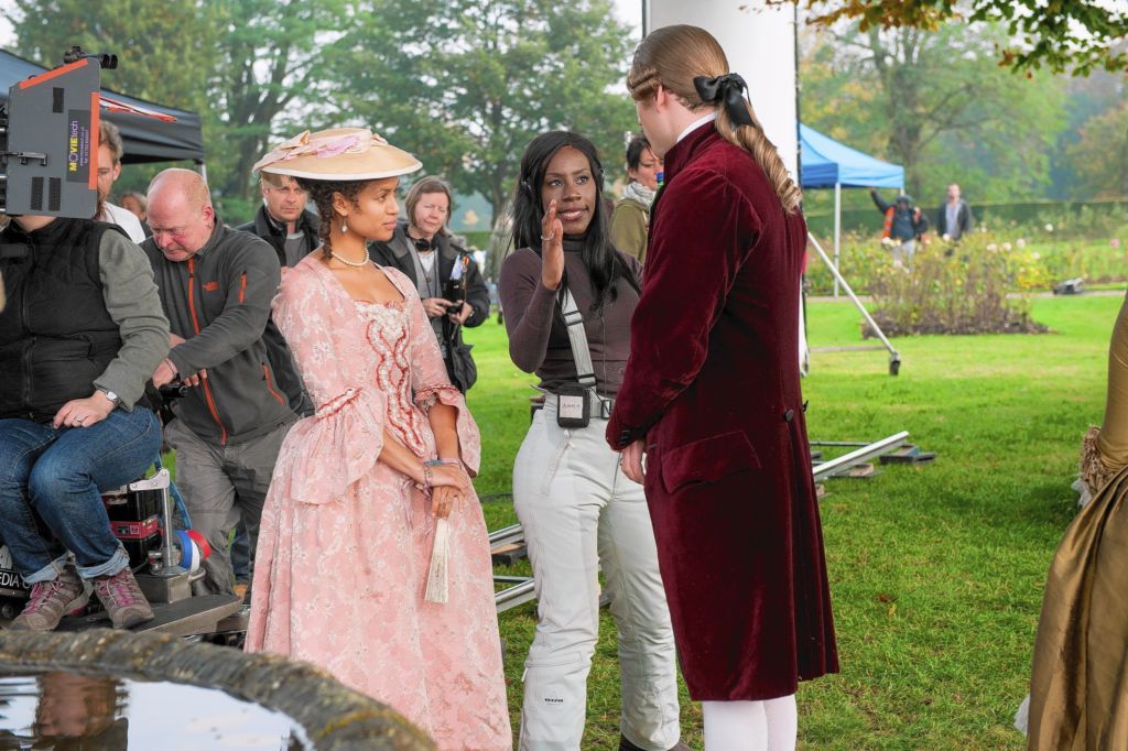 This photo was captured on the set of the film Belle (2013). It is a British period drama film directed by Amma Asante. The actress Gugu Mbatha-Raw (left), the director Amma Asante (middle) and the actor Sam Reid (right) are seen here in this picture.
