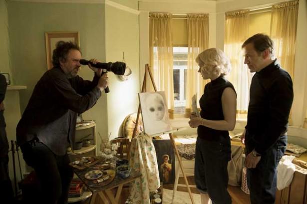 This still is from the film Big Eyes (2014). It is an American biographical drama film directed by Tim Burton. The actress Amy Adams (as Margaret Keane) and the actor Christoph Waltz (as Walter Keane) and the director Tim Burton (left) are seen here in this picture.
