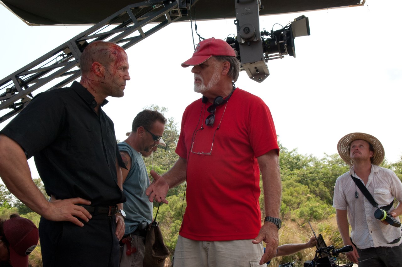 This behind the scenes photo is from the film Parker (2013). The actor Jason Statham (left) is being directed by Taylor Hackford (right) on the set. Parker is an American action crime thriller film and the main role parker is played Statham.