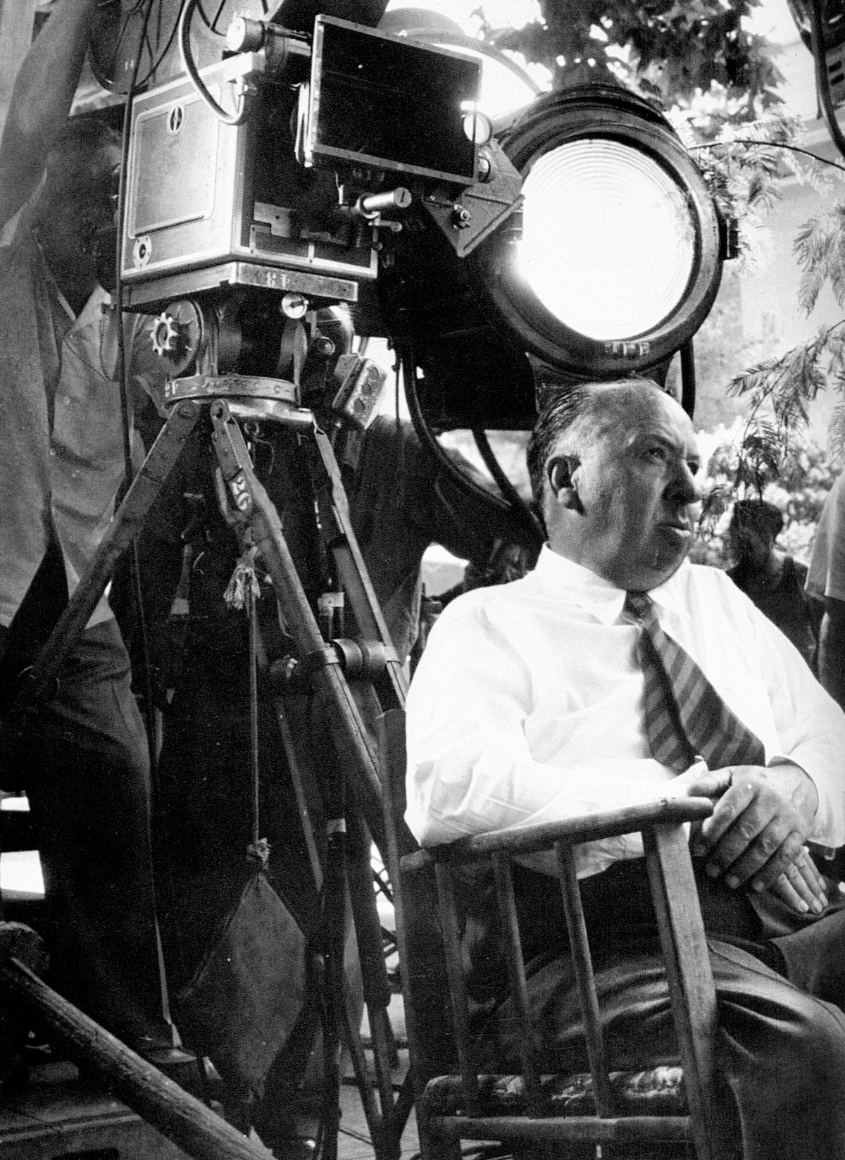 This photo was taken on the set of the film Vertigo (1958). It is an American psychological thriller film directed and produced by Alfred Hitchcock. The director Alfred Hitchcock is posing for this picture.