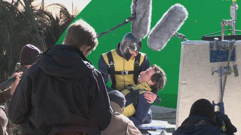This photo was taken while shooting the film X-Men : First Class (2011). It is a superhero film, directed by Matthew Vaughn. The actor James McAvoy (as Charles Xavier / Professor) can be seen lying there and the actor Michael Fassbender (as Magneto) can be seen kneeling down near James.
