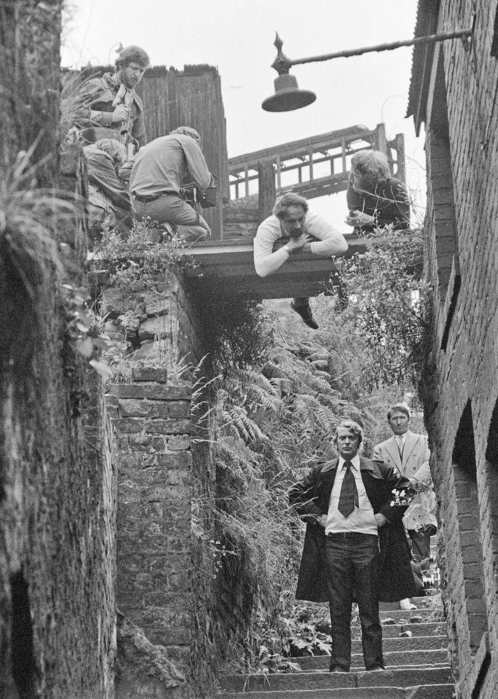 This photo was taken on the set of the film Get Carter (1971). It is a British crime film directed by Mike Hodges. The actor Michael Caine is snapped with the film crew on the set.