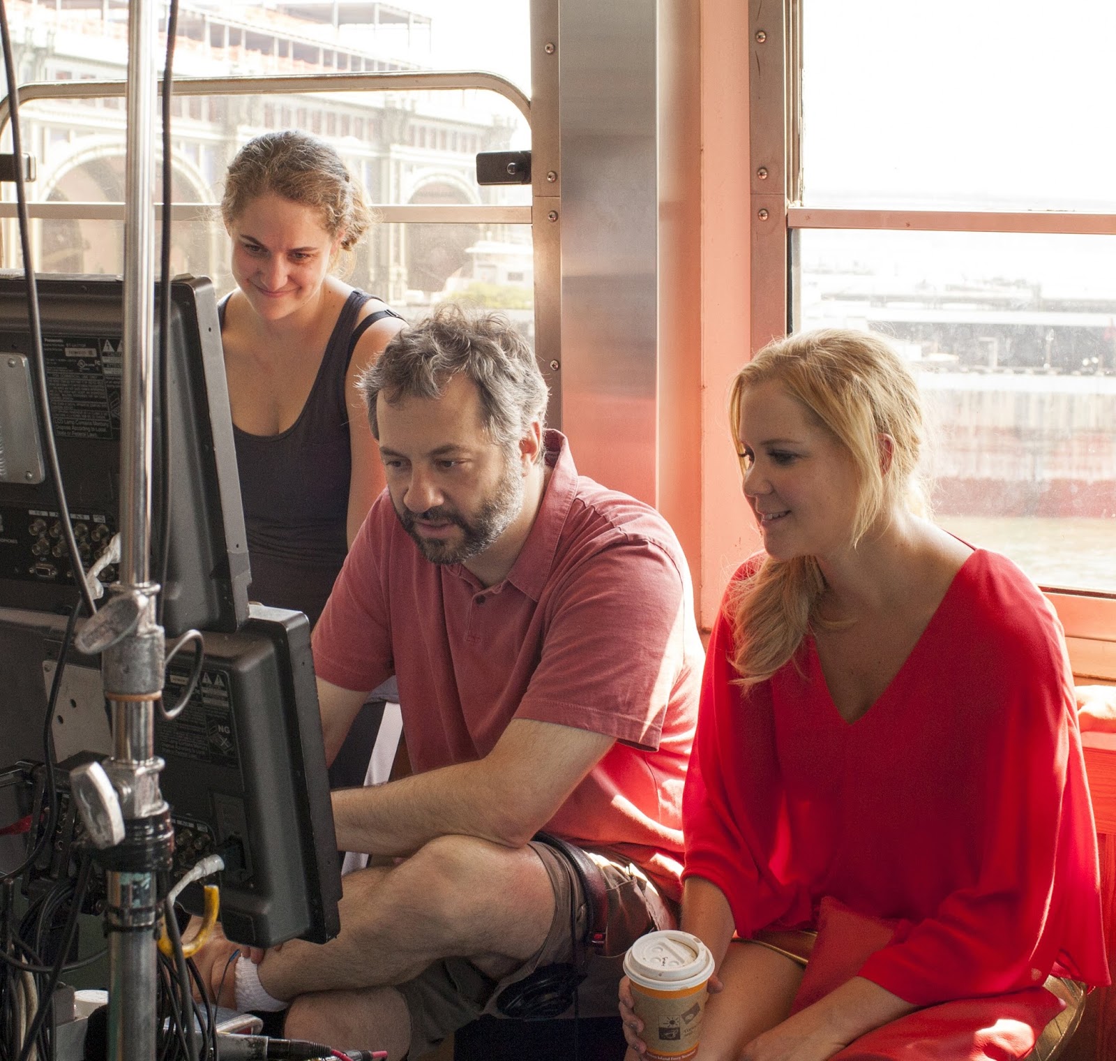 This photo was taken on the set of the film Trainwreck (2015). The still photographer Mary Cybulski (left), the director Judd Apatow (middle) and the actress Amy Schumer (right) can be seen in this picture. Trainwreck is an American comedy film directed by Judd Apatow and written by Amy Schumer. This film grossed $140.8 million, against a budget of $35 million.