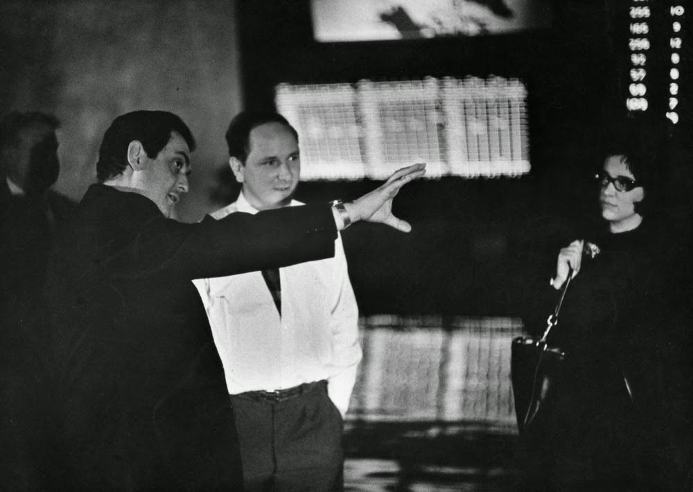 This behind the scene image is from the film Paths of Glory (1957). The director Stanley Kubrick (left) can be seen sharing his vision with the camera operator Kelvin Pike (middle) and the director’s wife Christiane Kubrick (right). Kubrick married Christiane after casting her as the German singer in the film.
