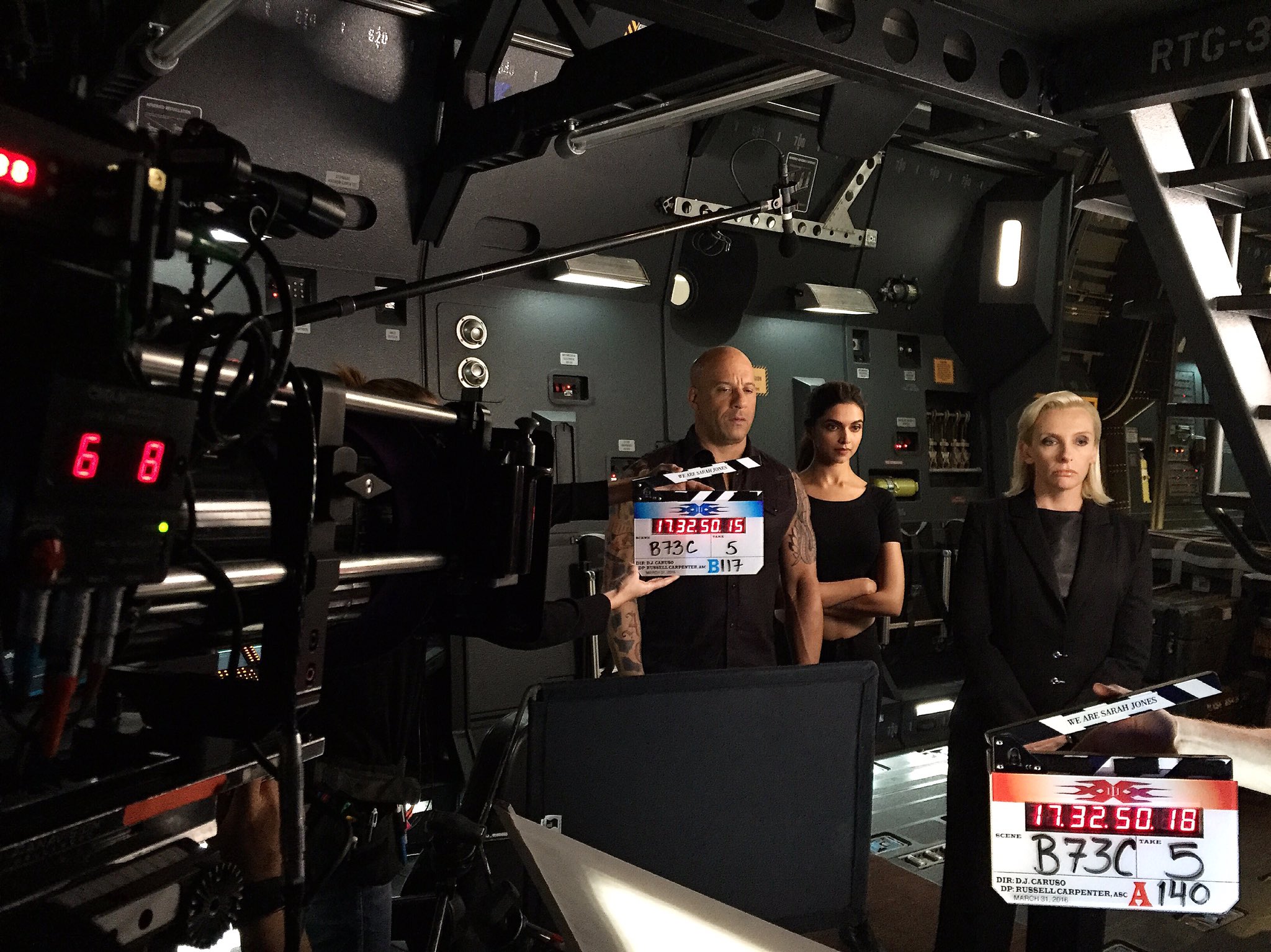 Actor Vin Diesel (left), actress Deepika Padukone (middle) and actress Toni Collette (right) can be seen getting ready for the next scene on the set of the film xXx: Return of Xander Cage (2017). It is an American action film directed by D. J. Caruso. It is the third installment in the xXx franchise. It received mixed reviews from film critics and has grossed over $345 million worldwide against a production budget of $85 million and became the highest-grossing film of Revolution Studios and in the franchise.